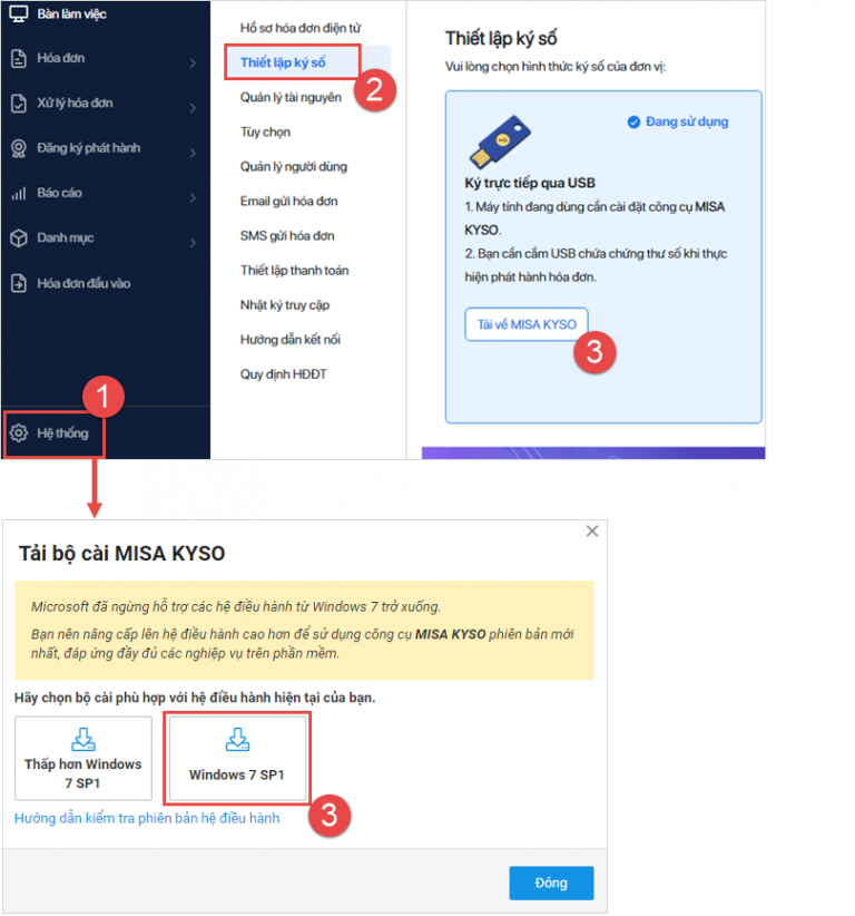 - Vào Hệ thống/Thiết lập ký số/Tải về MISA KYSO / Chọn 1 trong 2 bộ cài sau để tải: